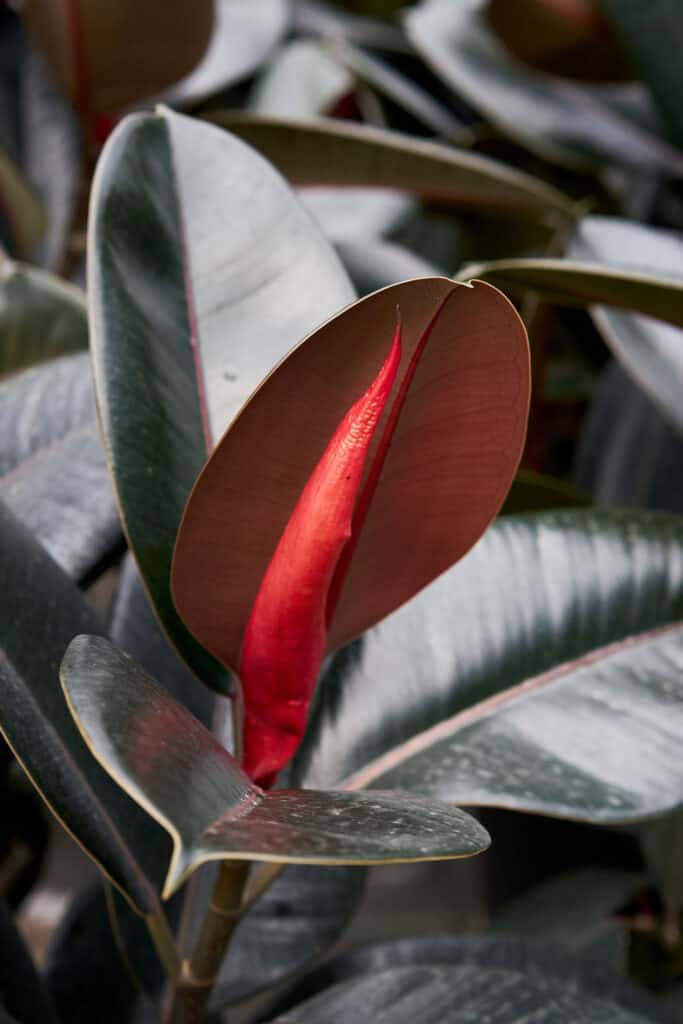 A popular ornamental plant with shiny burgundy leaves and distinct pink new growth.